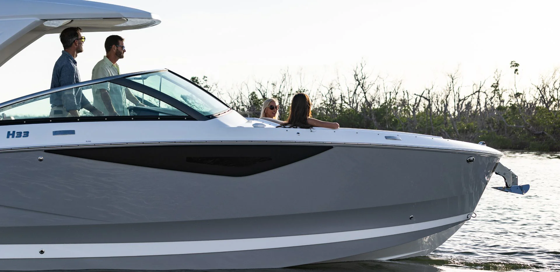 Die Four Winns H33 in der Innenbord-Version vereint Raffinesse und Eleganz mit klaren Linien und einem markanten Design – inklusive integrierter Scheuerleiste, senkrechtem Bug und geneigter Windschutzscheibe. Dieser Bowrider präsentiert sich im modernen, einzigartigen Stil und ermöglicht gleichzeitig ein flüssiges, intuitives Fahrerlebnis.