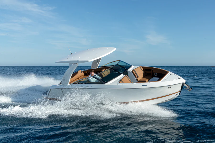 Entdecken Sie die Four Winns H9, ein wahres Symbol für Raffinesse und Eleganz. Mit außergewöhnlicher Liebe zum Detail gestaltet, vereint sie klares Design mit höchstem Komfort für unvergessliche Momente auf dem Wasser. Genießen Sie ein intuitives Marineerlebnis ohne Kompromisse, bei dem jeder Augenblick zum reinen Vergnügen wird.