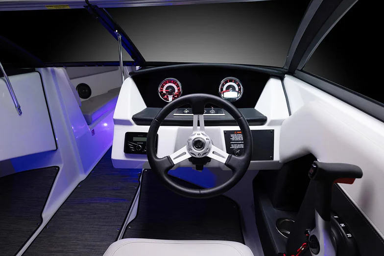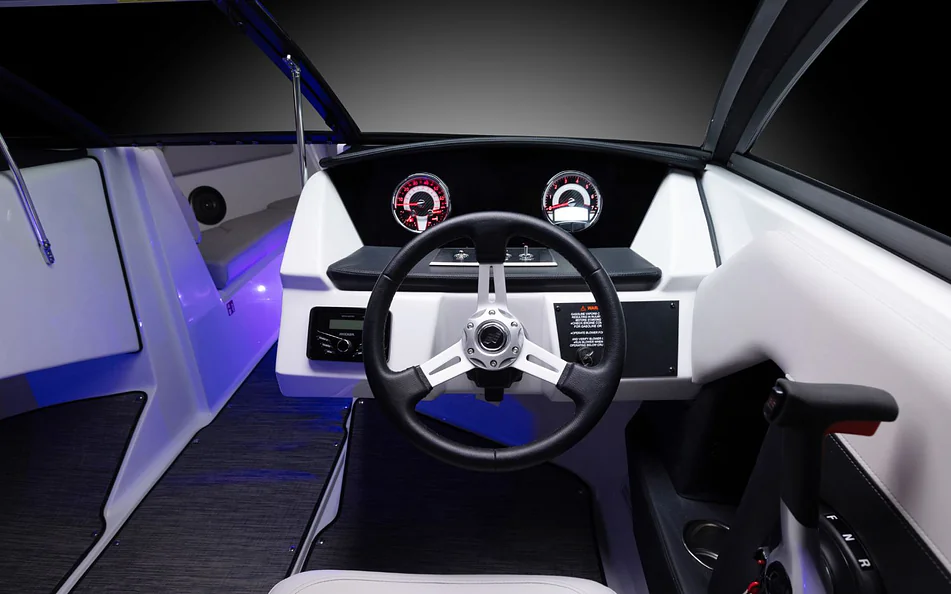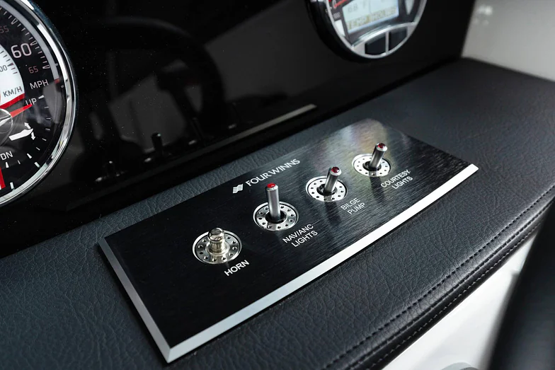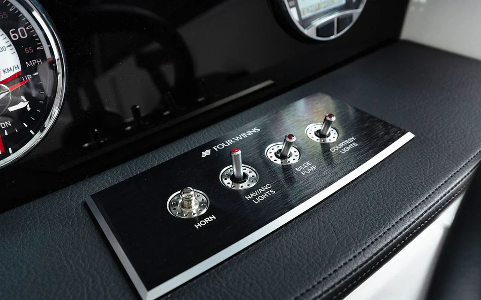 Stay in tune with your boat and surroundings with an array of detailed analog gauges on your sporty and stylish dashboard, displaying water depth, water temperature, boat speed, and RPM. Located below your gauges are stainless steel toggle switches, which perfectly accent the design of the H Series.