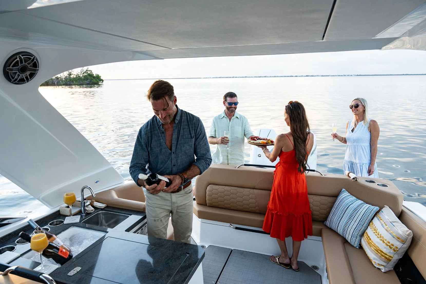 Le grand cockpit arrière en forme de L est parfaitement conçu pour recevoir des invités et partager des moments mémorables. Ce cockpit accueillant est équipé d'une cuisine entièrement fonctionnelle avec un grill, un évier et un réfrigérateur, permettant de préparer des repas en mer avec facilité. Des glacières spacieuses et des options de son et lumière ajoutent une touche festive à l'espace, rendant chaque instant à bord encore plus agréable.