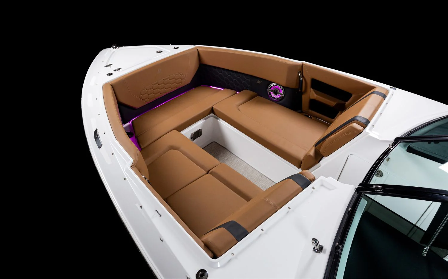 Plongez dans l’univers sophistiqué du H9, un modèle conçu avec soin, doté de terrasses latérales raffinées, un dossier rabattable pour profiter du soleil et d'options personnalisables Sa sellerie cousue main de haute qualité, ses finitions élégantes et son design épuré reflètent l’esthétique Four Winns. Le cockpit ergonomique garantit une navigation fluide, tandis que les nombreux espaces de rangement et la cuisine intégrée allient fonctionnalité et confort.