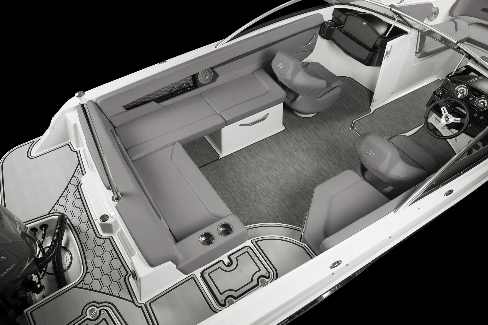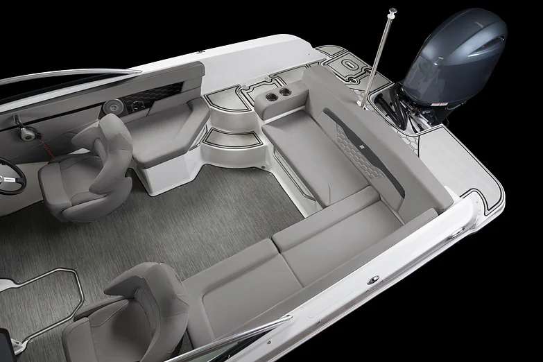 The outboard configuration opens up the entire stern, adding a full extra seat, increasing cockpit length, and creating a more accommodating layout for families, gear, and watersports.